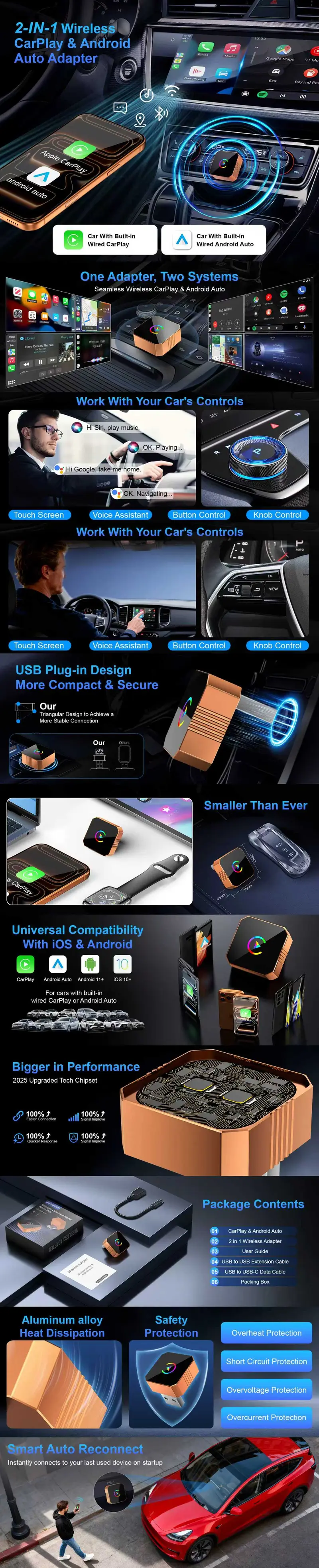The  Wireless CarPlay Adapter offers seamless, fast, and convenient connectivity for both iPhone and Android devices. It supports hands-free calling and acts as an electronic charger, ensuring you stay connected and powered on the go.